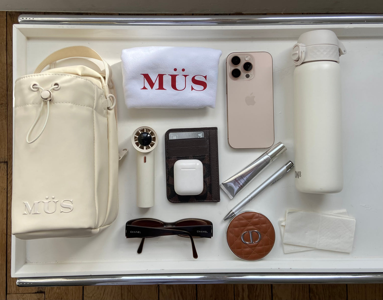 téléphone, écouteurs, clés, bouteille d’eau, serviette, gloss ou baume à lèvres, carte de salle…